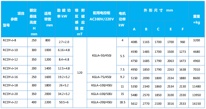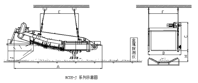 四、RCDY-J系列懸掛式組合回收型除鐵器主要技術(shù)參數(shù)、外形尺寸 執(zhí)行標(biāo)準(zhǔn):JB/T7689、JB/T10885