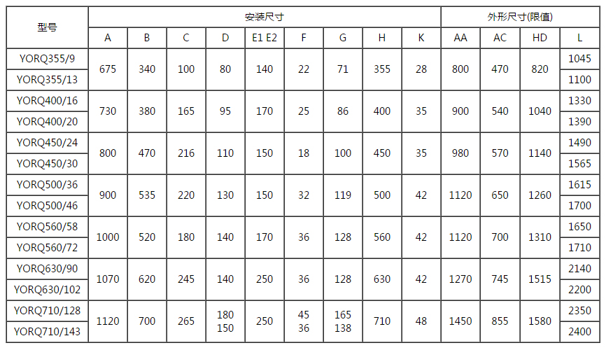 表1 YORQ短系列永磁耦合調速器外形及安裝尺寸表(機座號355~630)